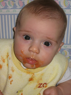 De groentepap is een enorm succes van het begin, meestal eet hij al een 200 gr groentepap, en hij kent ondertussen al worteltjes, tomaat en brocolli, al kan deze laatste niet op zoveel bijval van hem rekenen. "namme namme nam" is zijn lievelingszinnetje tijdens het eten en alles onderkliederen is natuurlijk ook heel fijn (bubbly heeft zich hier al moeten bij neerleggen :-( )